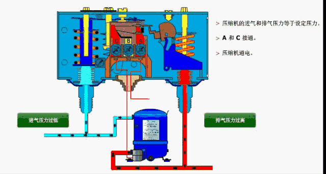 压力控制器能防止进气压力(蒸发器压力)过低或排气压力(冷 凝器压力)过高,以此控制和保护系统。