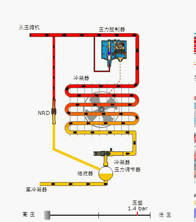 3. 凝器压力调节器接近关闭或完全关闭,热气排气管路与储液 器的压差达到 1.4 bar,压差阀(NRD)开始打开,以提高储液器 的压力。