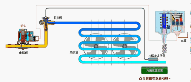 冷藏室温度上升时,感温包压力上升到设定值,电源端子 1 和 4 接通,从而打开电磁阀,允许制冷剂流入蒸发器。温度下降时, 感温包内的压力下降到设定值。端子 1 和 4 断开,子 1 和 2 接通。电磁阀断电并关闭,因而限制制冷剂流向蒸发器,使冷藏室温度上升。