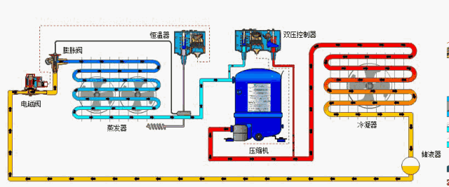 • 用压力调节器维持低压端和高压端的系统温度及压力。