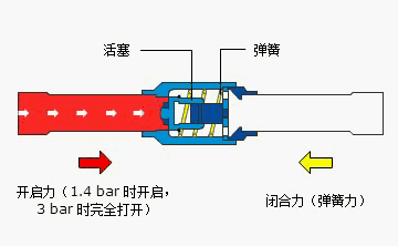 在内部弹簧力作用下,阀门在压差达到 1.4 bar 时开始打开,达 到 3 bar 时完全打开。阀门的压差越大,其开合度也越大。