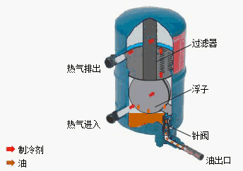 4、油位升高时,浮子打开一个针阀,让油回到压缩机集油槽。